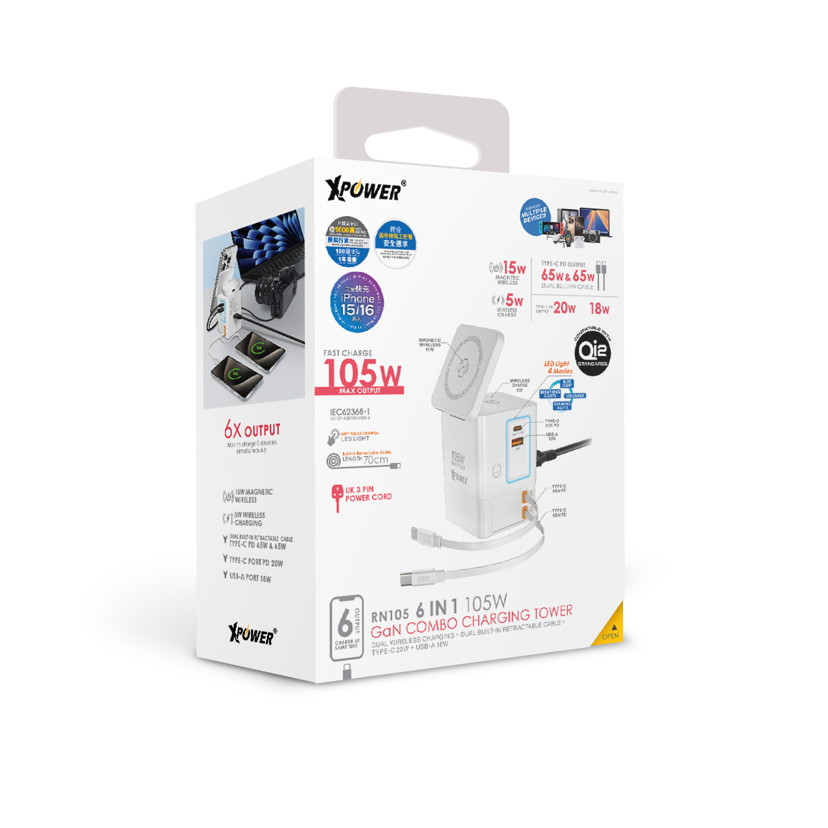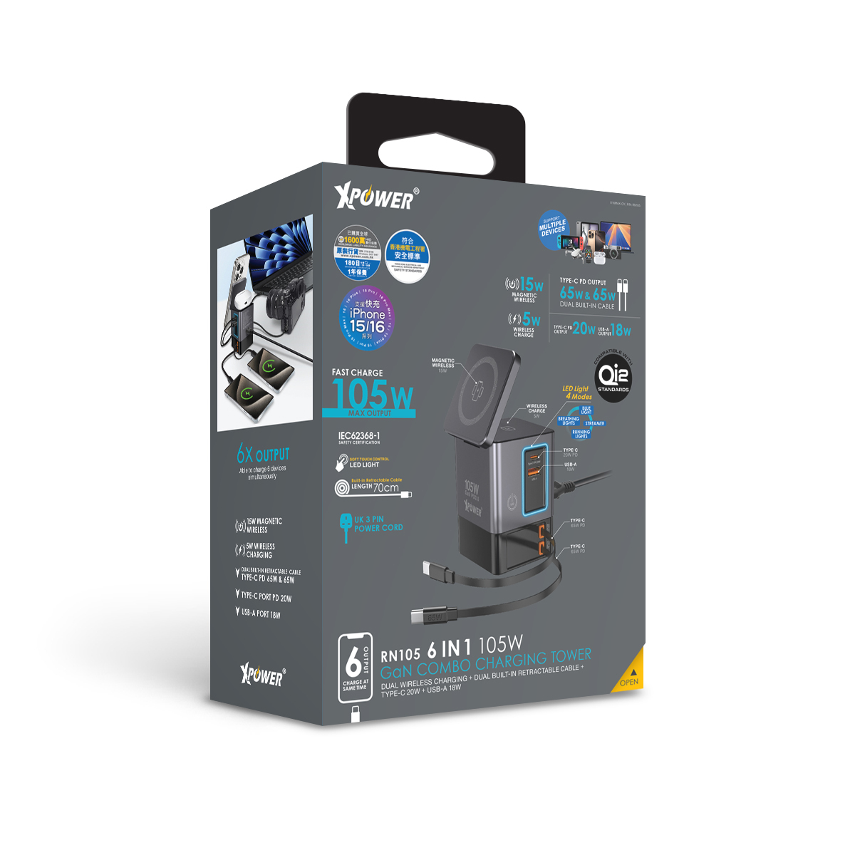 XPower RN105 Qi2 6輸出 105W GaN 雙無線快充+雙內置伸縮線塔式充電器