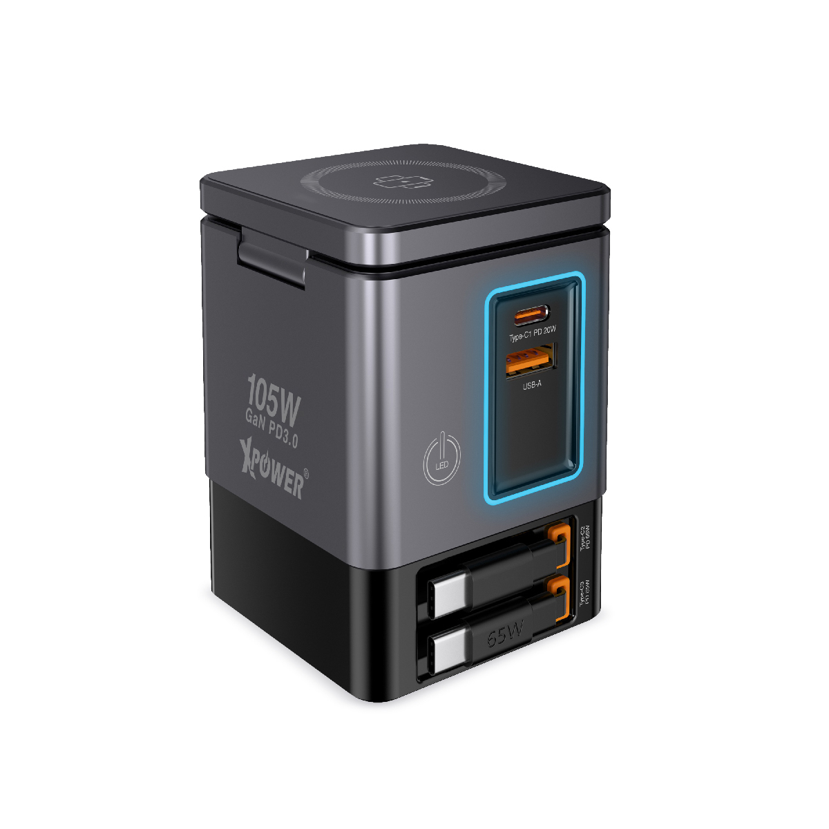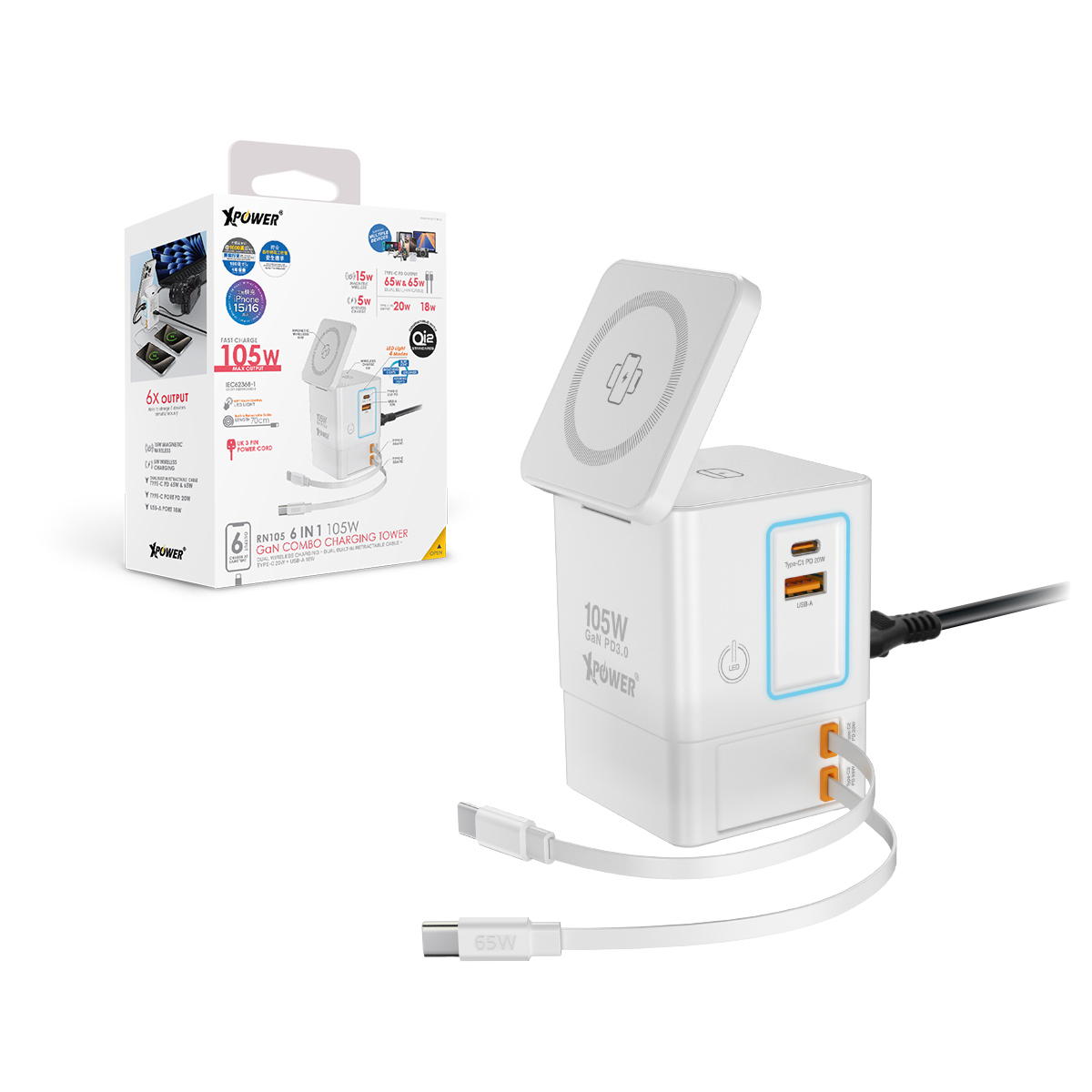 Xpower RN105 Qi2 6輸出 105W GaN雙無線快充+雙內置伸縮線塔式充電器