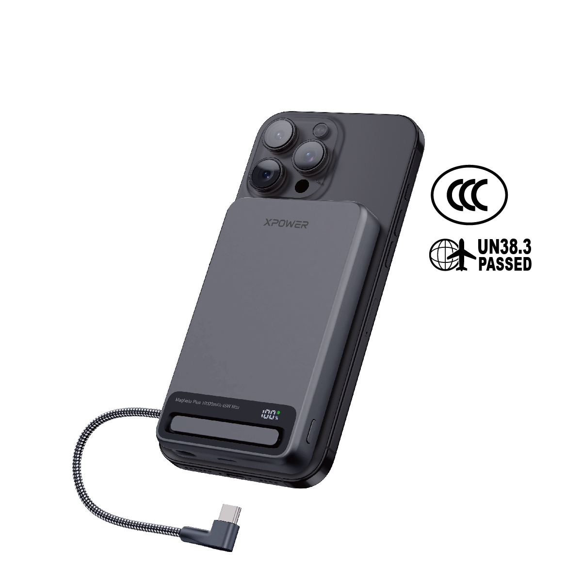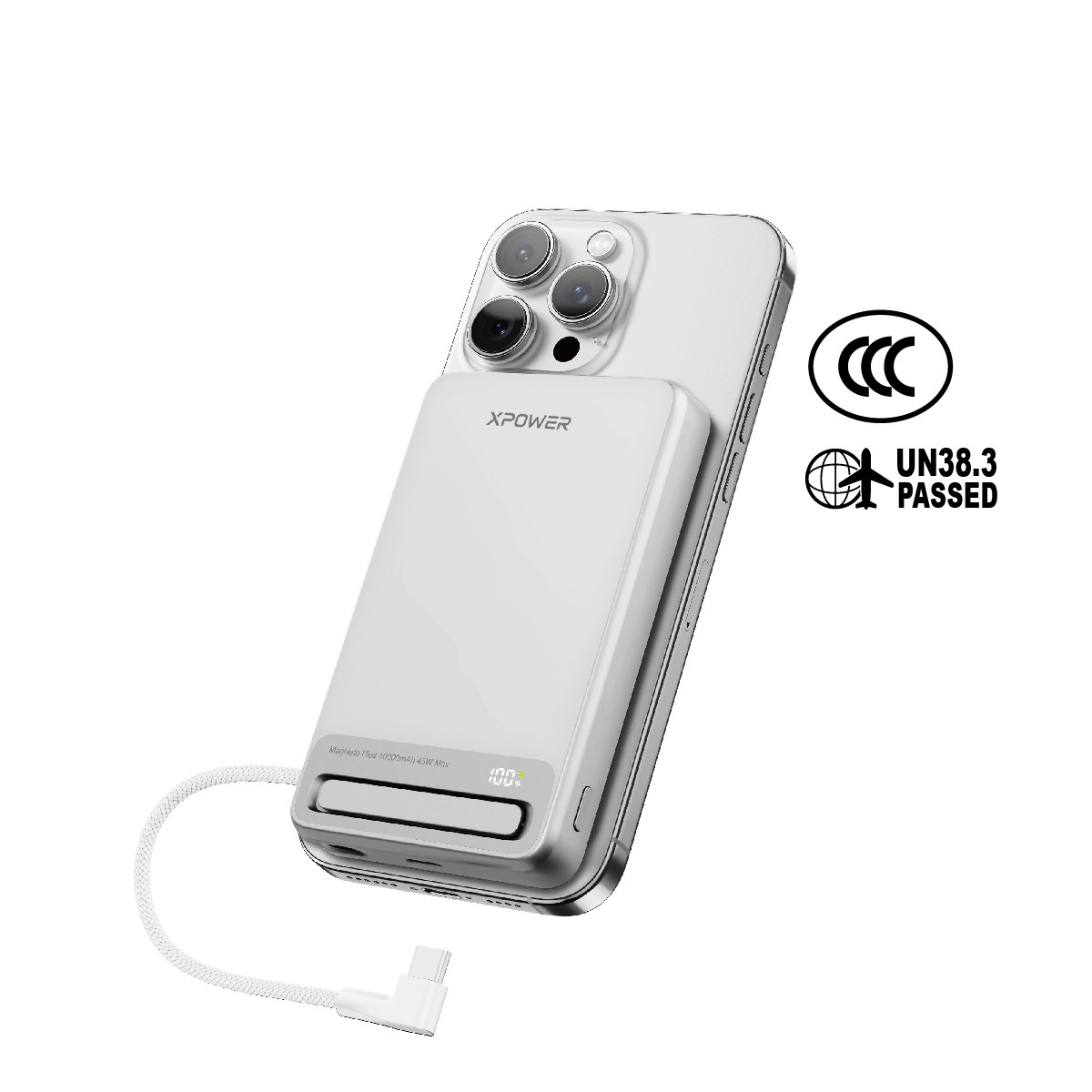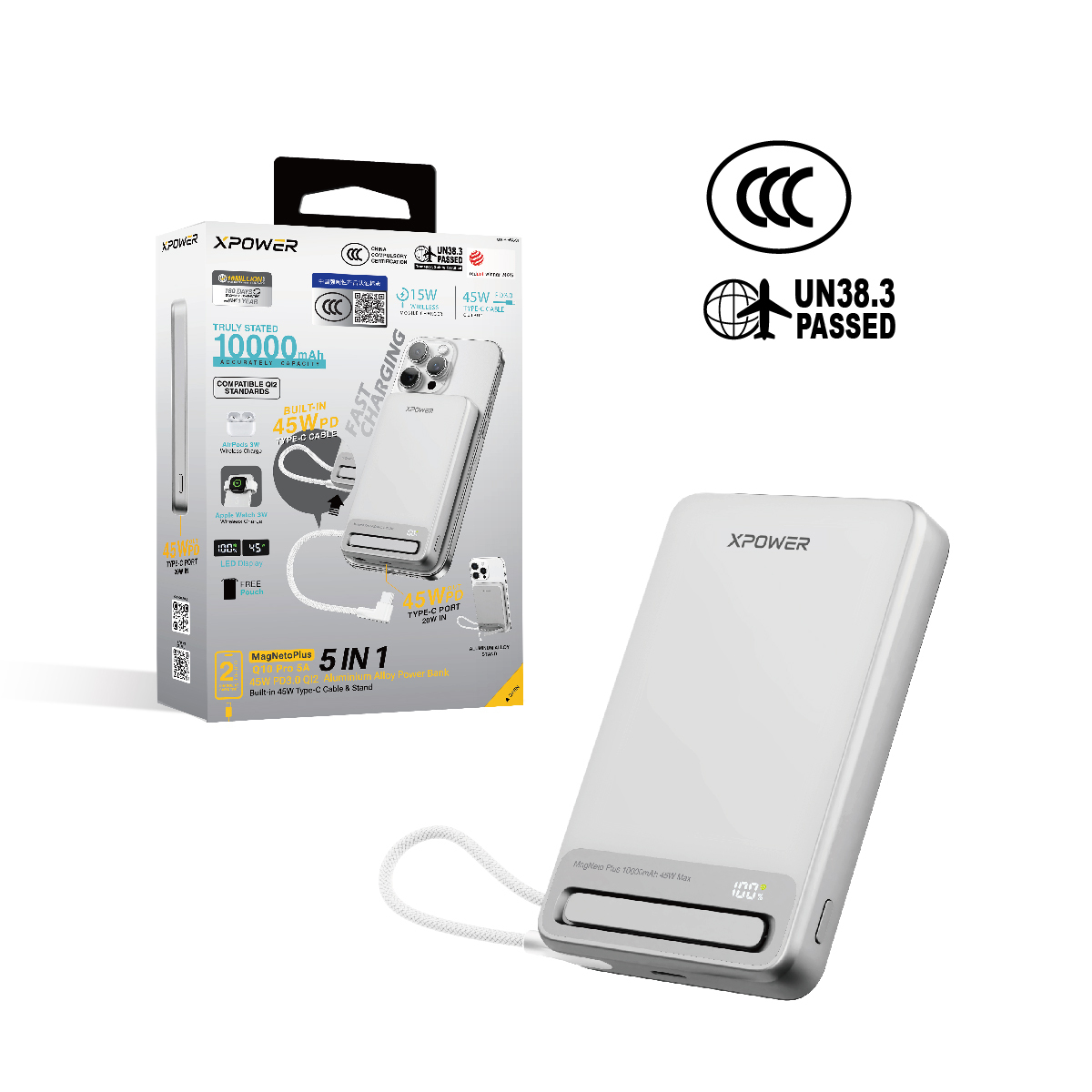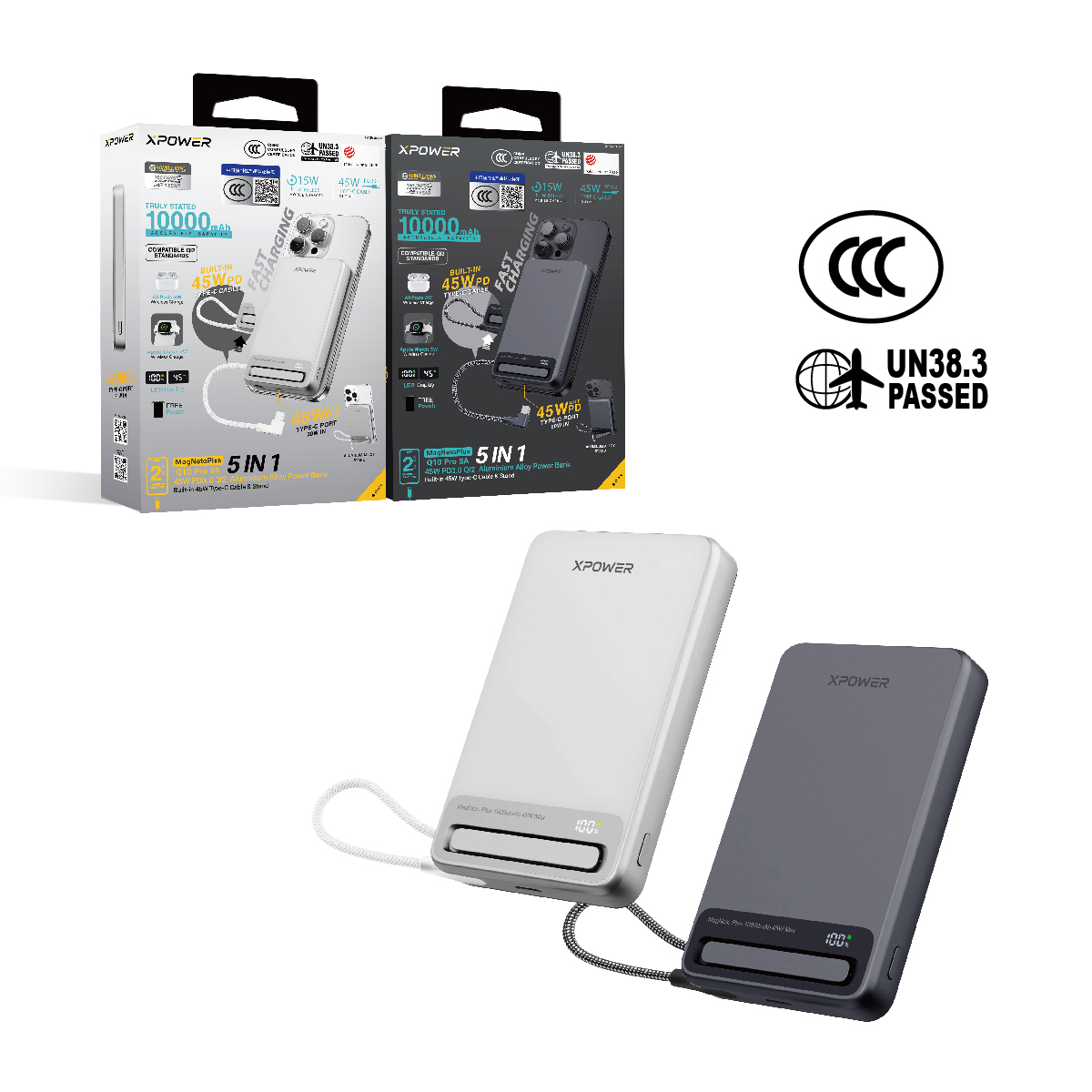 MagNetoPlus Q10 Pro 5A鋁合金10000mAh 45W PD3.0支架及數顯QI2磁吸移動電源內置45W Type-C充電線